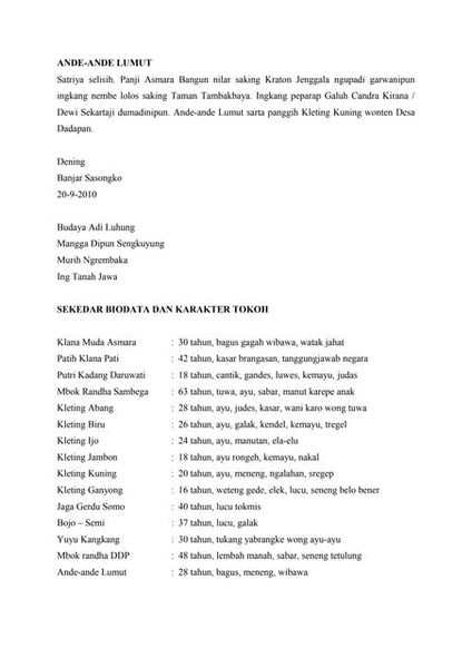 Seorang pemuda tampan bernama Panji Asmarabangun harus meninggalkan kerajaan dan istrinya karena suatu masalah yang ia hadapi. After an enemy attacked their kingdom Dewi Sekartaji. View NASKAH DRAMA ANDE ANDE LUMUTdocx from BAHASA IND MKDU4110 at Universitas Terbuka.